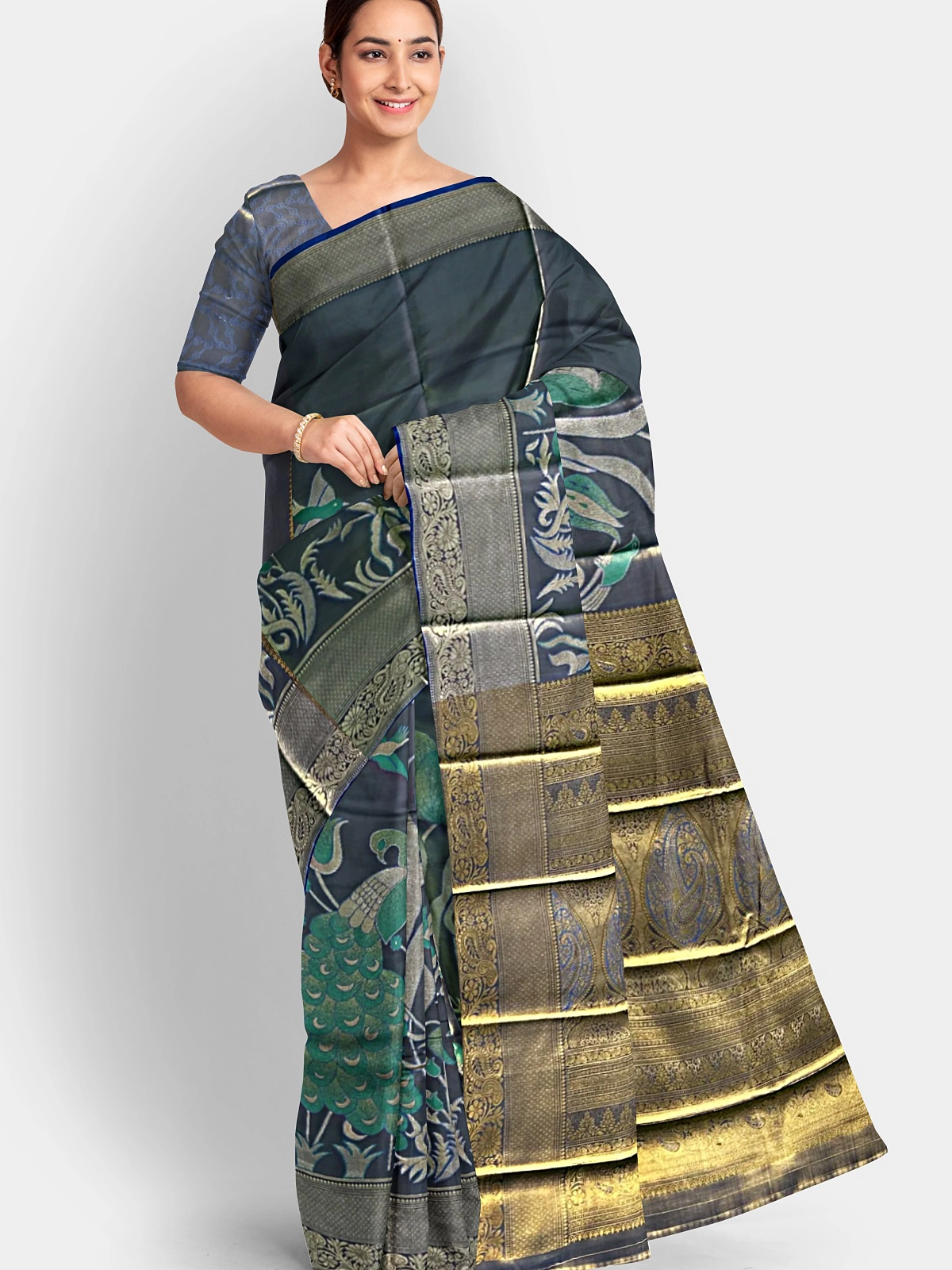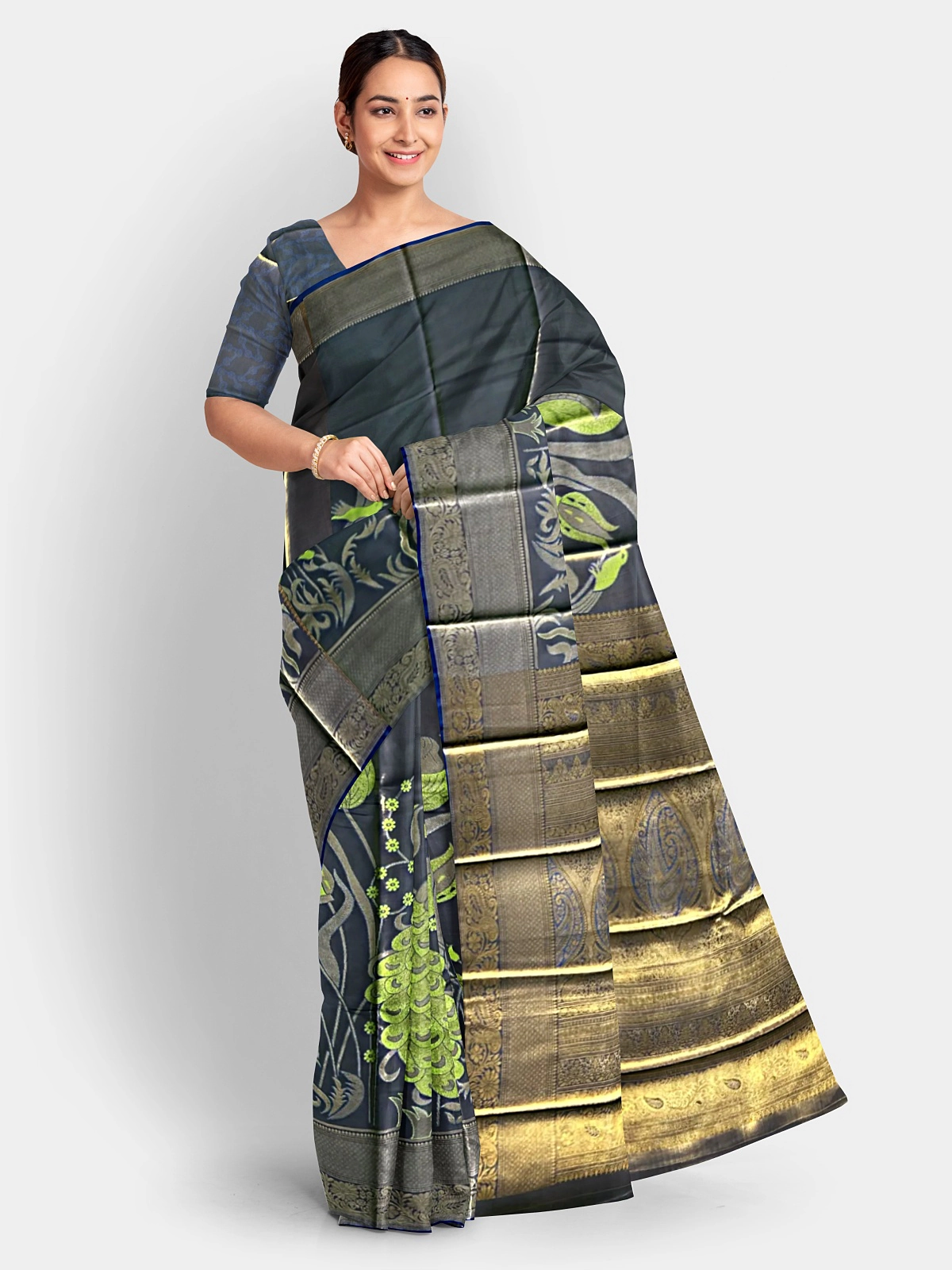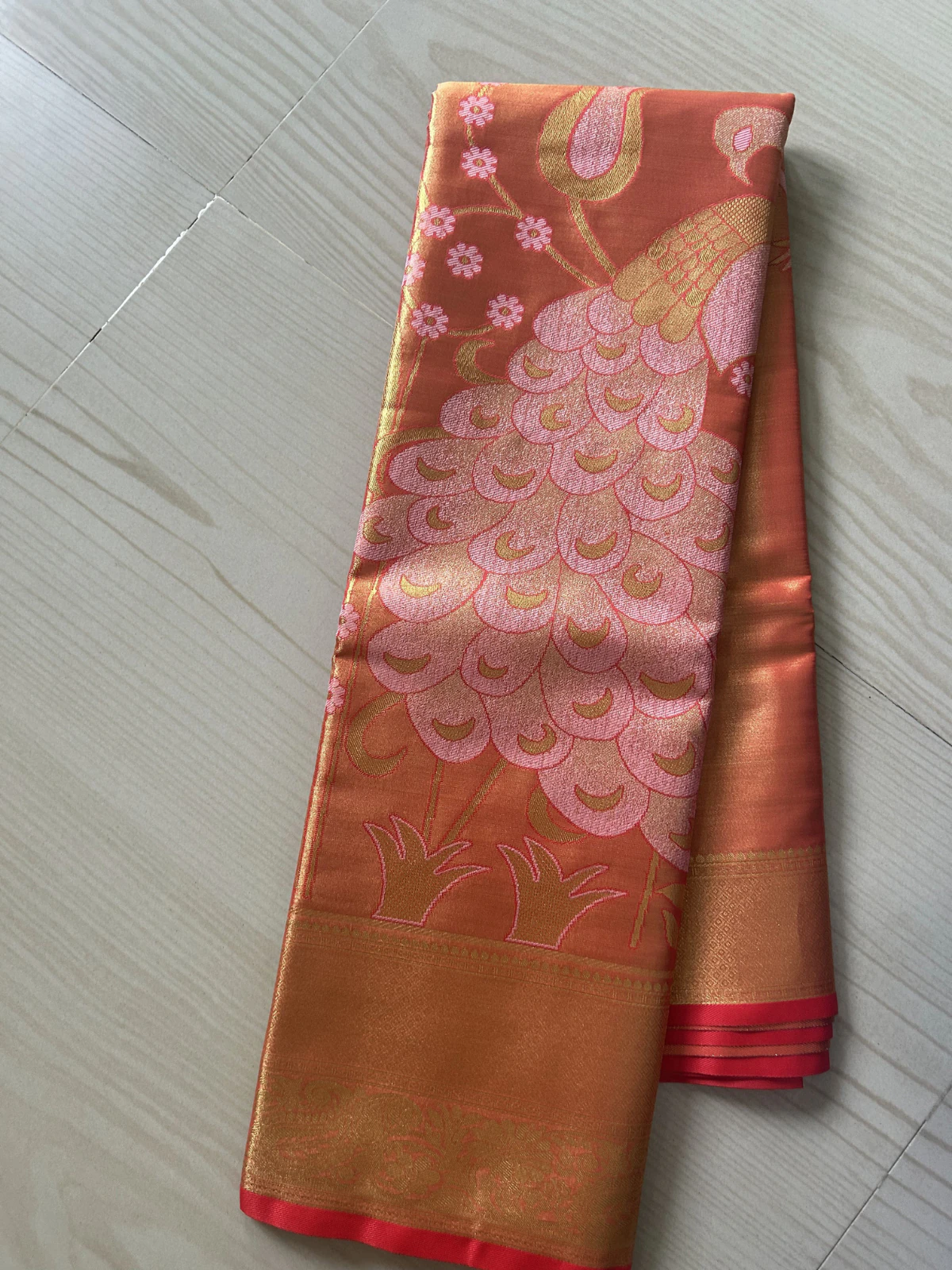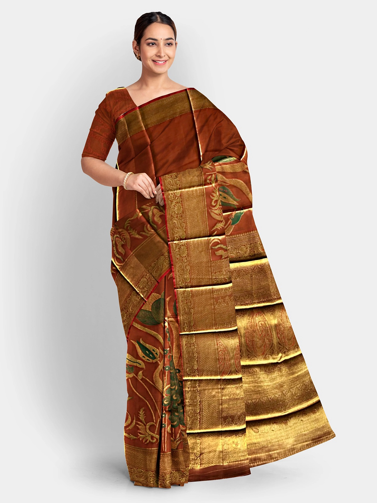 This copper-orange saree is adorned with delicate ivory-white birds and shimmering floral zari work, giving it a warm, festive glow. The radiant colour paired with soft contrast motifs makes it perfect for traditional functions, seasonal celebrations, and elegant day events.