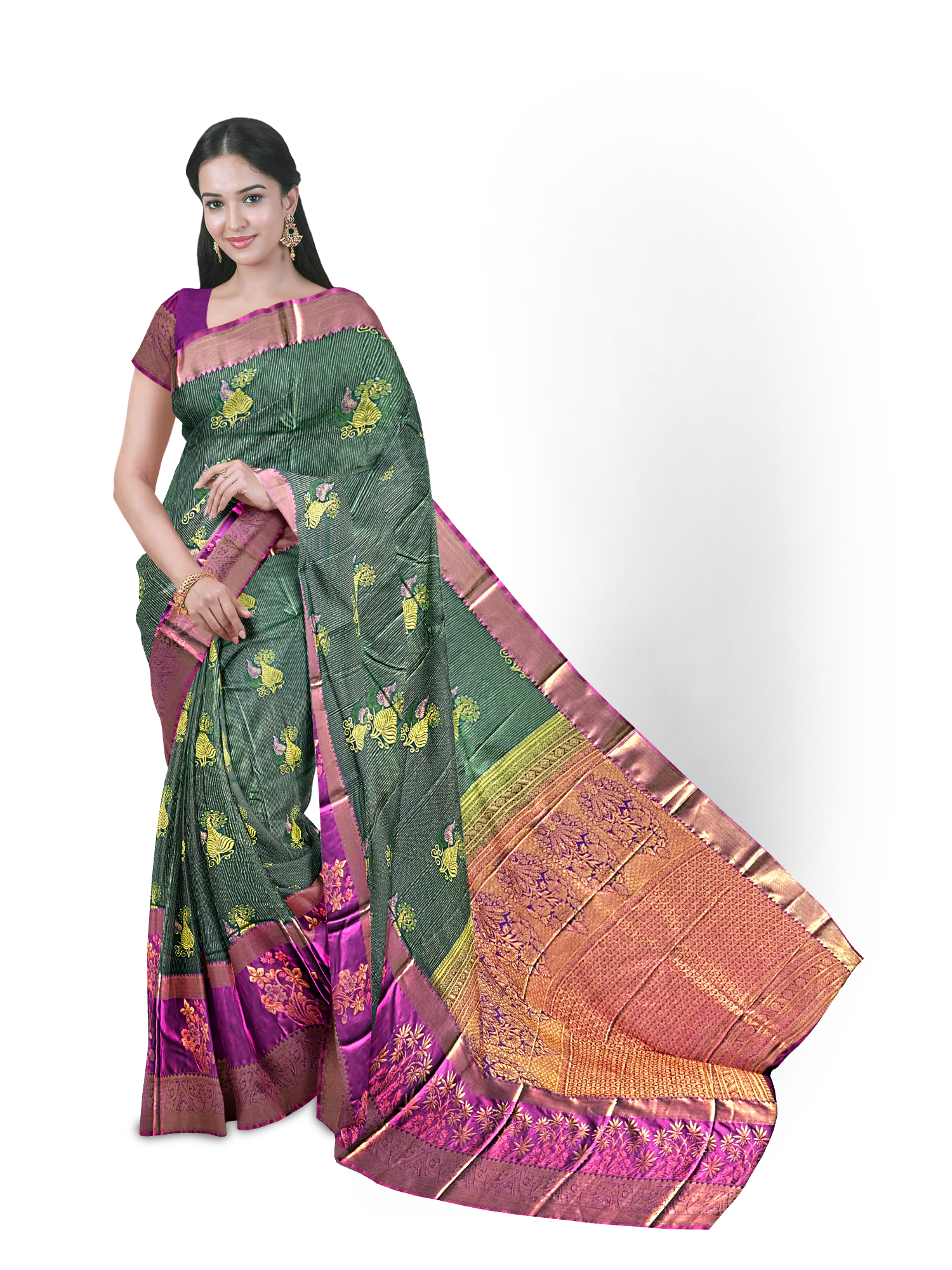 A luxurious deep violet saree featuring refined gold floral zari motifs, paired with a rich teal green pallu with fine gold striping. The heavy antique gold brocade border gives it a grand and regal look, perfect for bridal wear, festive occasions, and grand functions.