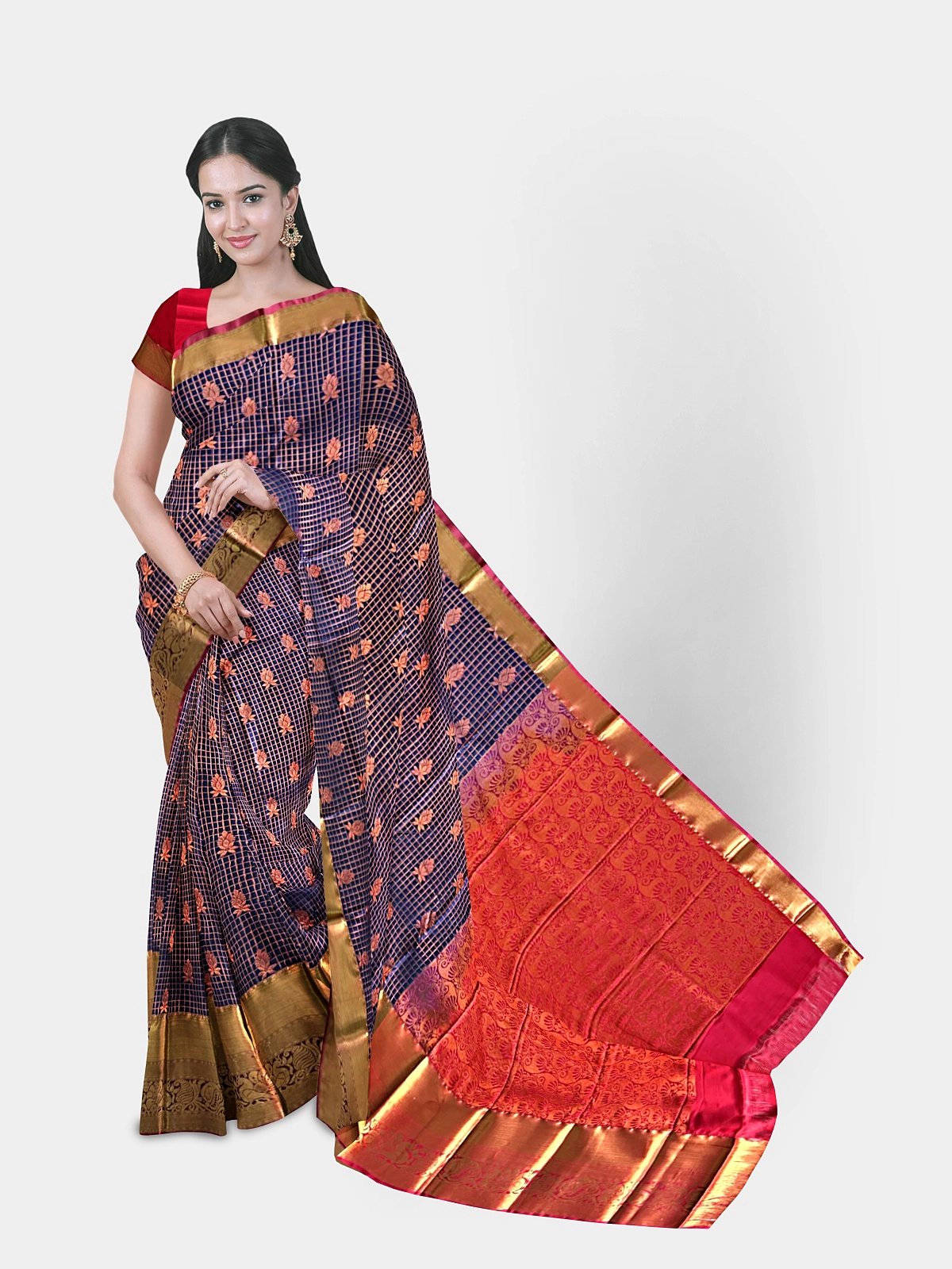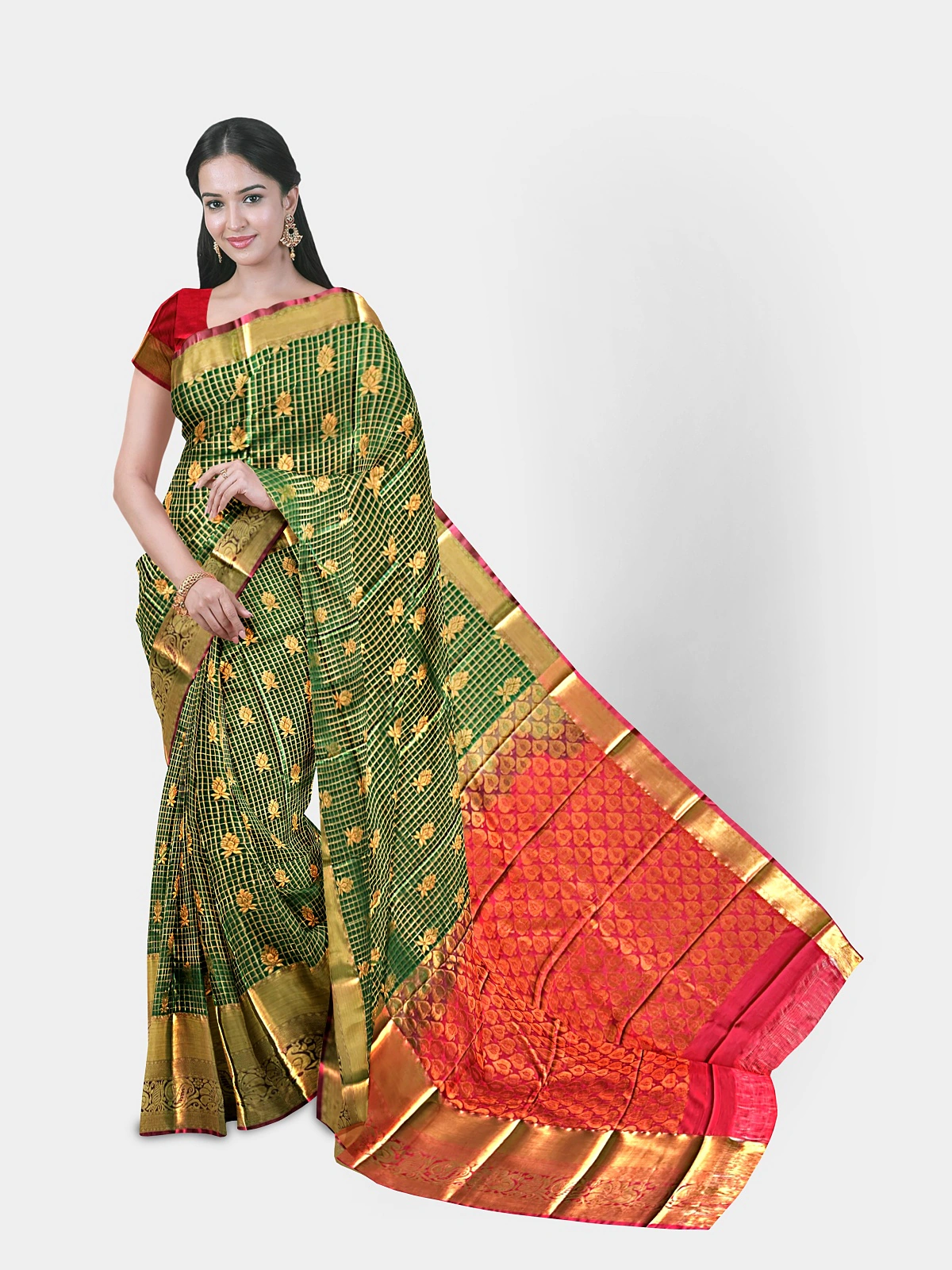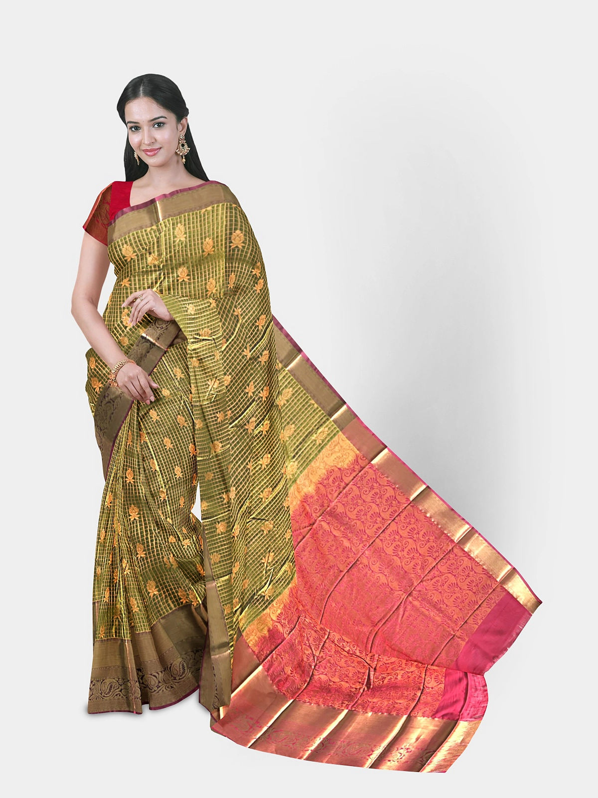 This elegant soft silk saree features a vibrant magenta body highlighted with delicate checks and gold floral motifs, giving a rich and festive appearance. The saree is complemented by a traditional gold zari border with a subtle copper–pink sheen, adding to its grandeur.